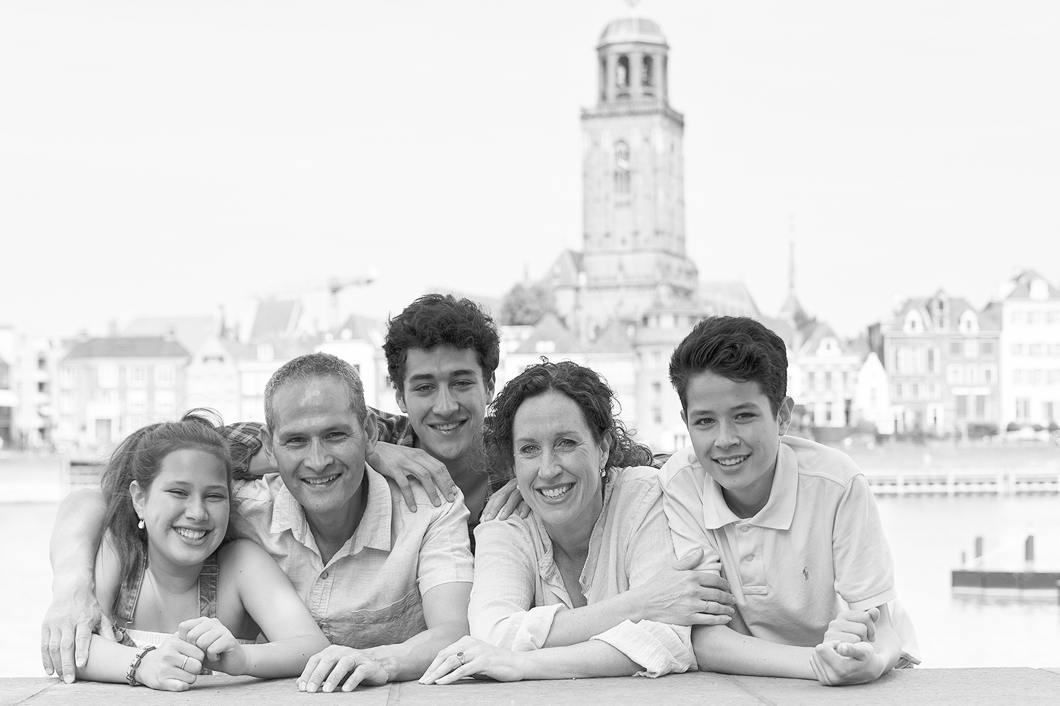 Familieportret aan de IJssel met in de achtergrond de skyline van Deventer